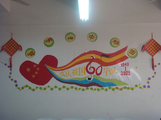 “红旗飘飘”,”热爱祖国”,”祖国万岁”,”欢庆祖国六十年的标语”以不同的方式舞动在各个班级的壁报上。同学们把对祖国的热爱通过优美的文字和图画,生动形象地表达出来。