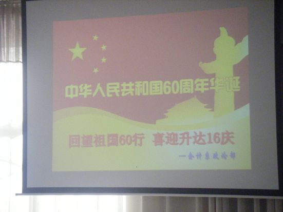 会计系团委副书记焦雨薇的讲话拉开了会议的序幕,她说在祖国60华诞,创办人王广亚博士投入教育事业60周年,升达建校16周年之际,希望同学们通过观看视频来感受祖国和升达的发展历程。接着同学们共同回味了1949年的开国大典和刚刚落幕的六十年庆典,以及六十年来我国所取得的成就:两弹一星,第一辆汽车,圣火传递…同学们都为祖国的快速发展而惊叹,并发出声声感慨。随后政论部副部长高思博,剧伟对祖国的发展又作了进一步的总结,各班班长团支书也踊跃发言,最后会议在政论部副部长吕倩朗诵的文章《广阔天地,大有作为》中落下了帷幕。