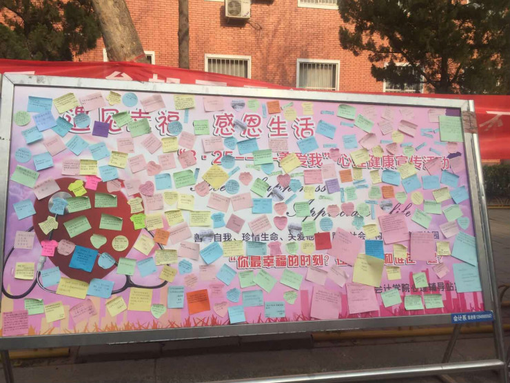 活动前期,首先365VIP英国上市官网心理辅导站召集心航路社团成员及各班心理委员说明活动前期宣传活动,各班心理委员在班级内进行动员和宣传,并让同学们在便利贴上写上“你最幸福的时刻?在哪里?和谁在一起?”这三个问题的答案,收集便利贴。同时通过365VIP英国上市官网微信公众号,微信,QQ等进行宣传,最后在综合楼前通过展板对此次活动进行展览,以达到更好的活动效果。