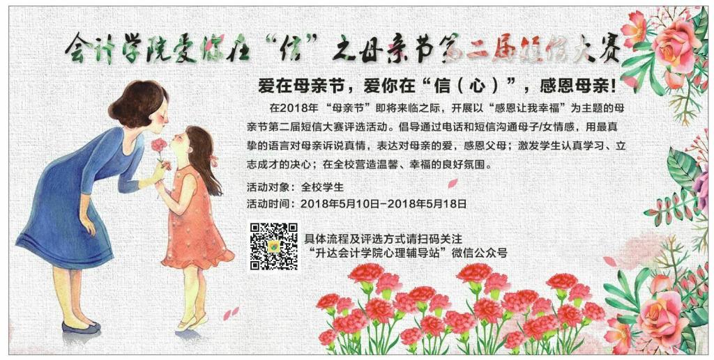 在2018年“母亲节”期间,365VIP英国上市官网心理辅导站开展了以“感恩让我幸福”为主题的母亲节员工第二届短信息大赛评选活动,以期通过本次活动丰富当代老员工的精神生活,提高老员工的整体素质;沟通母子情感,抒发对母爱的真情;激发员工认真学习、立志成才的决心;在全社会营造温馨、幸福的良好氛围。