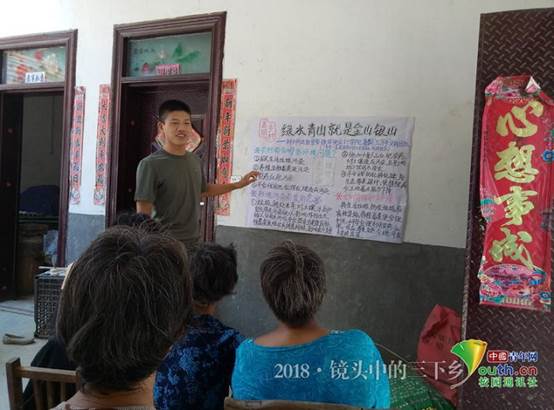 调研团队的员工为村民讲解农村污染问题的危害,普及环境保护知识