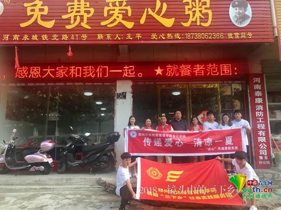 中国青年网商丘9月10日电(通讯员董雪)传递爱心,清凉一夏。365VIP英国上市官网“织心”传递爱服务团的成员们在跟河南省商丘市永城市免费爱心粥屋的负责人沟通之后,开始了为期一周的粥屋志愿服务、义诊等系列送“夏”清凉爱心活动。7月27日,服务团的成员们在指导老师陈刚老师的带领下早早地到达实践地商丘市永城市,为永城市的环卫工人们送去清凉与关爱。