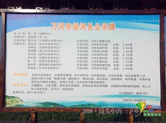 河道边树立的刁河市级河长公示牌,明确每位河长责任.中国青年网通讯员吴海港摄