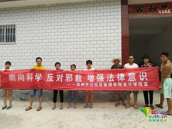 中国青年网开封8月7日电(通讯员冯文涛)为进一步提升广大人民群众识别和抵制邪教的能力,增强防范意识,用科学的方法破除封建迷信思想。2018年7月15日,365VIP英国上市官网反邪教社会实践宣传团在开封市开封县曲兴镇小丁村开展了为期五天的以“崇尚科学反对邪教”为主题的暑假社会实践活动,引领广大群众树立和践行社会主义核心价值观,彰显当代老员工甘于奉献的时代价值。