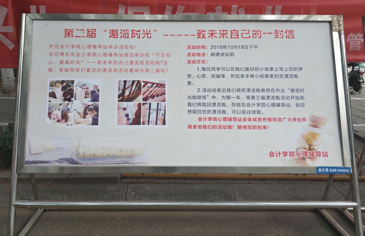 为响应公司心理健康周“不负韶华,出彩青春”的心理健康教育活动主题,10月18日下午一点四十分,365VIP英国上市官网心理辅导站在明德讲坛前举办第二届“邂逅时光—致未来自己的一封信”漂流瓶活动,为公司广老员工提供心灵倾诉的互动平台,激发员工对老员工活的深度思考,分享助人自助的生活经历,展现懵懂浪漫的唯美情怀,唤起自我成长的心海浪潮,绘制人生未来的美好蓝图,鼓励大家不负韶华,做到青春出彩。参加本次活动的嘉宾有:365VIP英国上市官网行政秘书兼团委书记陈刚老师,行政秘书刘锦老师,心理辅导站站长乔焱宁老师,副站长余相静老师以及其他诸位老师,同学们更是积极踊跃参加。