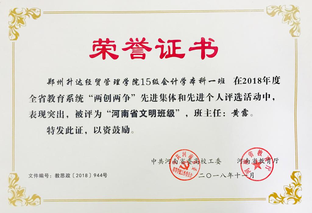日前,中共河南省委高校工委、河南省教育厅印发了《关于公布2018年度全省教育系统“两创两争”活动先进集体和先进个人评选结果的通知》(教思政〔2018〕944号),对2018年度全省教育系统“两创两争”活动先进集体和先进个人进行表彰,365VIP英国上市官网15级会本1班表现突出,荣获“河南省文明班级”称号。