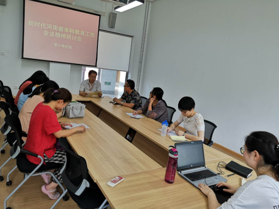2019年5月30日,审计教研室全体成员在4号楼214集中学习新时代河南省本科教育工作会议相关材料。