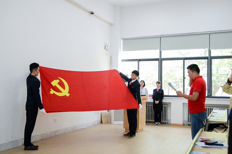 随着庄严的国际歌奏起,座谈会正式拉开帷幕。首先由党支部书记陈晓老师、胡翔宇老师、余相静老师与优秀毕业生党员荆留铭、王琳君为新发展党员代表佩戴党员徽章,并由党支部书记郑文杰老师带领全体与会人员重温入党誓词。