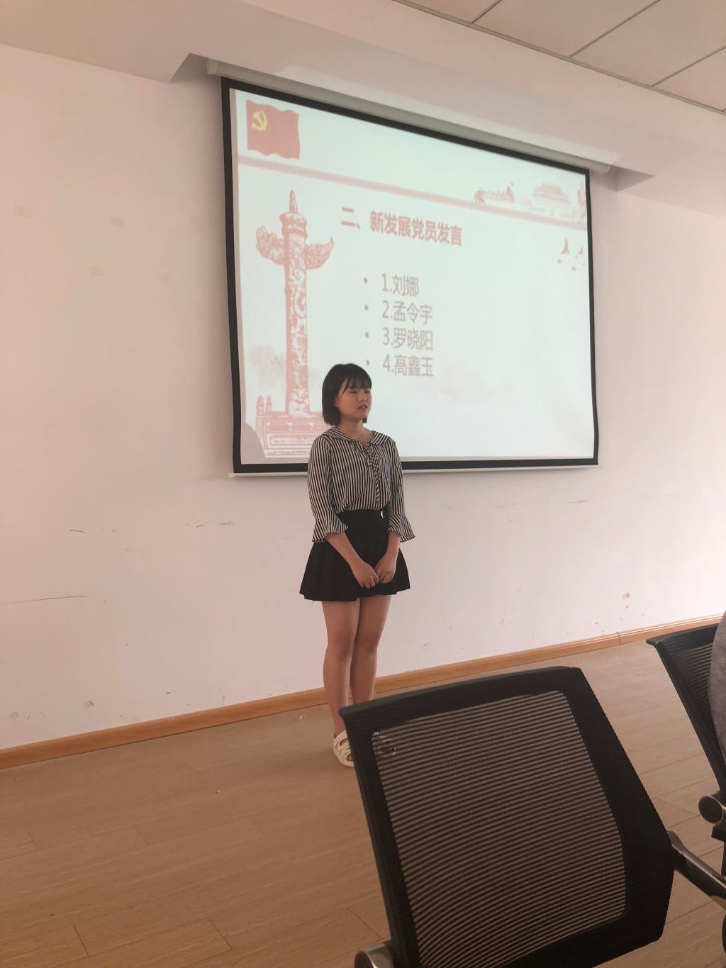 然后,刘娜、孟令宇、罗晓阳、高鑫玉4位进入党支部的预备党员发言,依次向党组织汇报自己的思想和学习情况,明确自己的政治立场,不忘初心,牢记党的使命,为党的事业奋斗终身。
