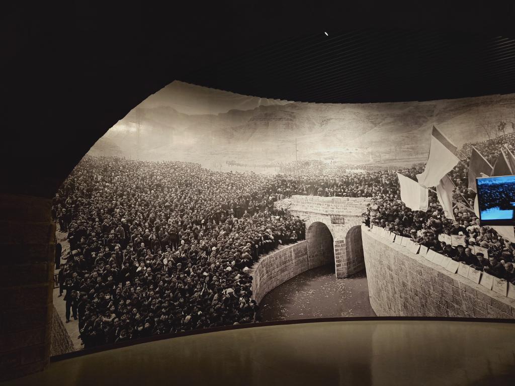 周恩来总理曾说过,新中国有两大奇迹,一个是南京长江大桥,一个是林县红旗渠。修建红旗渠是改造自然的一个大战场。红旗渠工地为前方,机关、厂矿、农村为后方,前后方紧密配合。当时物质条件虽然匮乏,但后方总是千方百计满足前方的需要。为圆一个水的梦,林州人民一直追寻着、奋斗着,每一块头都凝结着林州人民的心血和智慧。在红旗渠通水庆典时,几万林州人民到场观看,红旗渠水从闸门奔泻而出,流进了林县的村村寨寨,流进了林州人民心里。红旗渠的通水,不仅改变了林州人民的衣食住行,更多的是将这“自力更生,艰苦创业,团结协作,无私奉献”的红旗渠精神刻进每个林州人的骨子里,也印证了幸福是靠我们奋斗出来的。