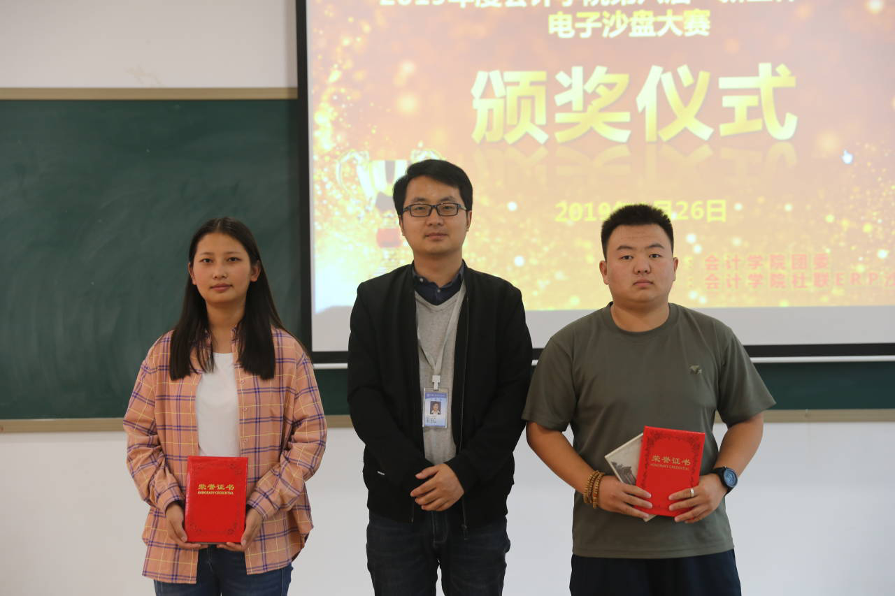 此次颁奖仪式,在主持人清朗的声音中,由365VIP英国上市官网行政秘书兼团委书记陈刚老师、365VIP英国上市官网实践教研室主任曾景伟老师、365VIP英国上市官网ERP沙盘协会指导老师张瑞亚老师、365VIP英国上市官网社团联合会副理事长郑文涛分别为获奖小组选手颁奖。