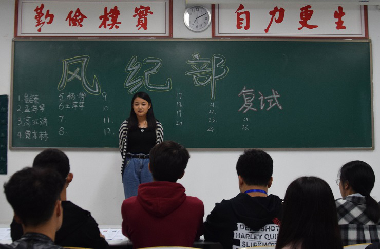 在面试过程中,各部门根据自身工作性质和工作重点提出了适宜的问题来考验同学们的组织能力、处理人际关系能力、沟通能力和创新意识等,面对台下众多的“主考官”,19级同学从容自信,对所提出的问题认真作答,言谈举止中流露出对团学会工作的真挚渴望和敢于表现自我的信心。同学们以演讲等形式展现出了自己最好的一面,并且积极展示出自己的特长,实力难分伯仲。在面试期间,团委副书记巫晓梦、员工会主席梁诗苑、社联理事长姜大川等主席团成员都亲临现场,指导招新面试工作。他们指出:在本次工作中要提高干事素质,注重质量等问题。