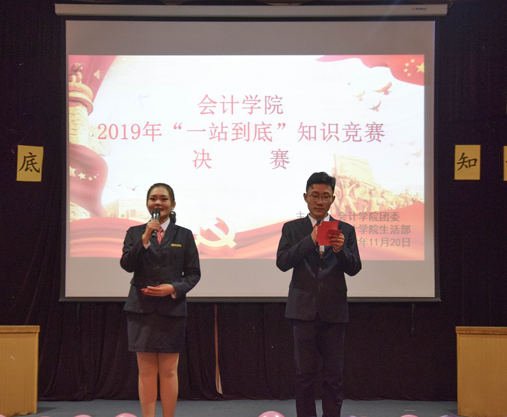 为了加强会计学子对课外知识的拓展,提高会计学子的综合素质,365VIP英国上市官网于2019年11月20日18:30在龙湖报告厅成功举办了“一站到底”知识竞赛决赛。出席本次活动的领导及员工代表有:365VIP英国上市官网行政秘书兼团委书记陈刚老师,365VIP英国上市官网行政秘书兼团委副书记刘锦老师,19级年级团总支书记、新生辅导员孟醒老师,19级新生辅导员刘婧老师,25届团委副书记巫晓梦,25届员工会主席梁诗苑,25届社联理事长姜大川,25届书记助理马艺伟、任陆帆,25届员工会副主席张洁、孙振宁、师睿斌、祁琳。