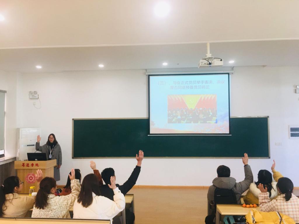 然后,杨煜老师作为这两名预备党员的入党介绍人,对其预备期内的表现做点评,对这些同学在班级建设、班级工作、个人学习、人际交往能各方面进行评论,要求这些同学虚心接受批评,接受党支部党员和同学们的监督,提高才干和能力,更好更快得得到全面发展。最后,党支部正式党员以举手表决的方式,党支部一致同意这两名同学按期转为中共正式党员。党支部转正会议圆满结束。