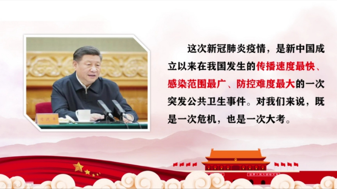 通过此次对《全民抗疫与坚定中国特色社会主义制度自信》主题团课的深入学习,我们对中国的社会主义制度有了更深的理解,也大大增加了同学们战胜新冠肺炎疫情的自信心和大国风范的民族自豪感。相信在党中央的带领下,全国人民携手努力,一定能够共克时艰,早日战胜新冠肺炎疫情。