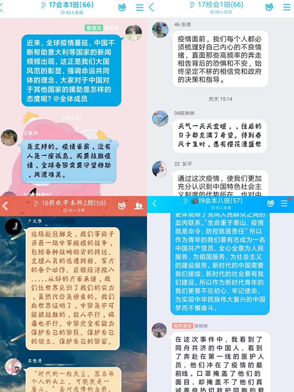 18税收二班齐子涵同学说:“中国此次应对新冠肺炎疫情雷厉风行,严格隔离防控,工作落实快,稳准狠,及时控制局面使新冠肺炎疫情后果降低到最少最小的损失,在习近平总书记的战略部署下,全国上下齐心协力,共同抗击新冠肺炎疫情,军民一心,此次疫情号传播速度快,但在大家共同的努力下得到有效的控制。经过学习,我明白了许多。明白了少年强则国强,少年独立则国独立的道理,明白了爱国的意义。新冠肺炎疫情如令,责任如山。在这场众志成城、同仇敌忾的战斗中,中国人民的团结信念和责任感令世界印象深刻。”