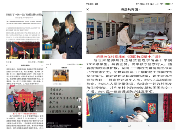 而胡世妹同学则主动向父母提出要到疫情防控的一线去。在征得父母同意后,胡世妹同学与安阳市滑县高平镇东留寨村村支书取得联系,报名参加志愿者,积极投身到村口出入车辆进行检查登记以及测量体温等卡点执勤工作。胡世妹同学还与当地卫生室取得联系,不管是村内人员还是外来人员,凡是发烧咳嗽者都及时记录,情况严重者上报并送到定点医院检查治疗。同时,胡世妹同学结合所学知识给村民普及冠状病毒肺炎防护常识,通过基层组织微信群、“村村响”应急广播等渠道及时将权威信息传达到家家户户。