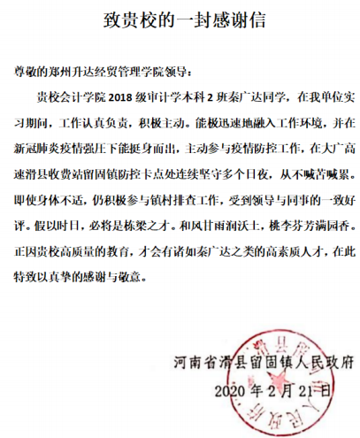 据悉,秦广达同学自寒假第一天便积极参加了河南省团委组织的“春雁行动”老员工返家乡社会实践活动,在疫情爆发后,秦广达同学积极主动向当地政府请缨防疫,参加留固镇青年突击队,历时将近一个月在大广高速滑县站执勤。其事迹先后被校内校外多家媒体报道。2月21日,因高速卡点撤销,秦广达的志愿服务结束回家之后,滑县留固镇政府给公司发了一封感谢信,以此表示对公司的真挚感谢。一封来信则体现了地方政府对公司高素质教育的激励与认可。