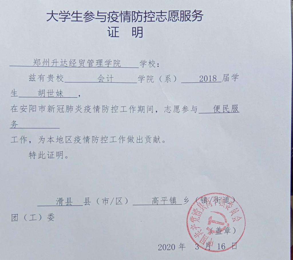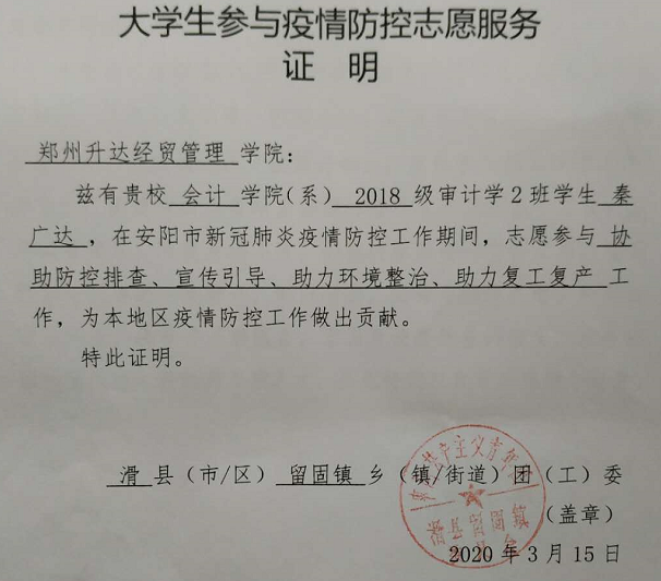 在志愿服务的同时,两位同学都加入了滑县志愿服务团队,近日,当地县团委为了表示对众多志愿者的感谢,让各乡镇团委为属地志愿者开具了防疫志愿服务证明。而滑县县团委在统计在校老员工志愿者人数时,滑县籍升达学子则占了滑县在校老员工志愿者人数的一半。再一次彰显了公司三大教育的优良传统和校训精神,更加提高了公司在滑县当地的知名度。