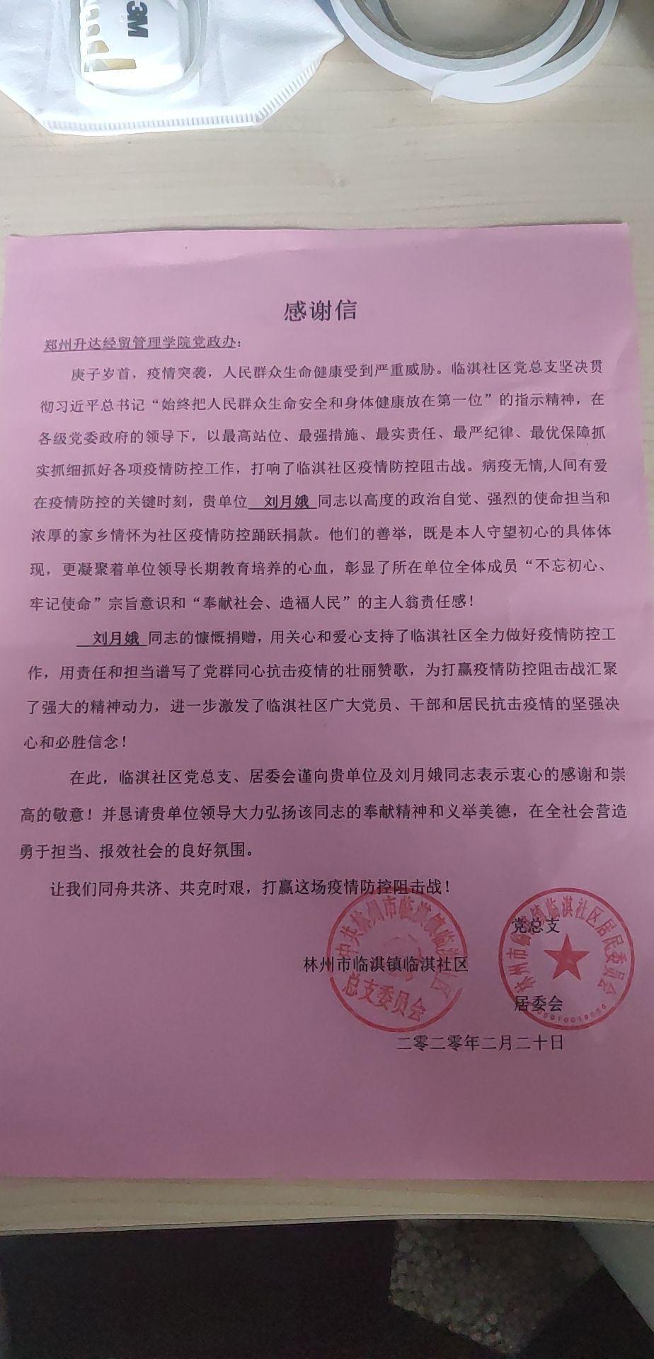 刘月娥同学是365VIP英国上市官网18级税收一班的同学,该同学家在林州,在疫情防控期间,积极向当地政府捐献善款。