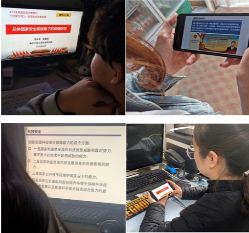 其次,党总支要求各支部认真组织全体观看马骏教授的国家安全日讲座《安全日谈安全,疫情之后的安全挑战》。本次讲座,马教授结合自己多年积累的专业知识和实践经验,与大家分享了:“什么是国家安全,为什么提出了总体国家安全观,我国在新时代面临的安全挑战;我国发展与崛起面临的三大安全困局;整体国家安全观包含哪些重点领域;疫情之后,我们的国际环境和战略空间;什么是底线思维”等内容。通过收看讲座,广大师生进一步提高了国家安全意识,丰富了国家安全知识。与此同时,同学们以班级为单位纷纷通过手机和电脑媒体,在课后进行线上讨论,在线交流观看学习所得的感悟,反响热烈。大家纷纷表示,广大青年要将总体国家安全观贯穿于日常生活,提升维护国家安全的自觉性和主动性。19级会本5班的郭梦姣同学说:“国家的安全是靠我们每一个人来维护的,我们应该增强自身意识,天下兴亡,匹夫有责,我们是国家将来的希望,国家的发展和繁荣是要靠我们这一代人继往开来的。”