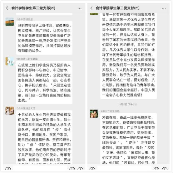 活动中,张晓老师带领党支部党员认真学习了马明杰等10名老员工优秀群体的先进事迹,教育大家要学习他们胸怀祖国,服务人民的国家情怀;学习他们敢于冲锋在前的党员精神;学习他们无私奉献的责任担当;学习他们脚踏实地的青春实践。在疫情防控关键时期,员工党员要坚定理想信念,要把灾难当教材,与祖国共成长,要在各班级发挥党员先锋模范作用,积极配合公司开展各项员工工作。