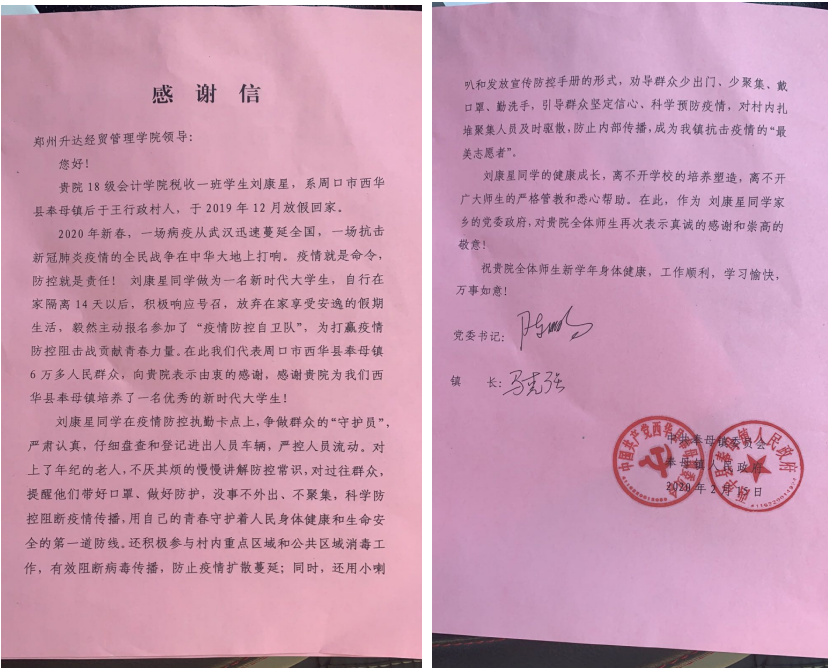 疫情就是命令,疫情就是责任。在得知乡村需要志愿者去参加抗议活动后,公司365VIP英国上市官网18级税收1班员工刘康星同学积极响应村当支部号召,投入到疫情防控工作中去。当人们问他为什么要从事这么危险的活动中去时,他总会说:“我是一个老员工,在祖国需要的时候,我感觉我需要为了家乡做一些什么;在公司,创始人通过校训教育我们,要‘尽我力,做公益’,所以,我来尽自己的一分绵薄之力”。