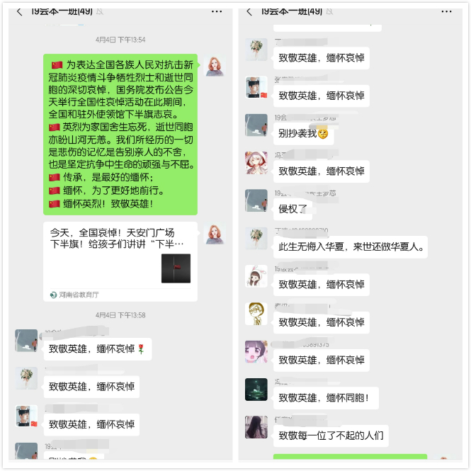 清明节是中华民族的传统节日,也是进行爱国主义教育的有利时机。在新冠肺炎疫情防控的特殊时期,借此机会运用线上平台召开主题教育班会激励全体员工弘扬以爱国主义为核心的民族精神和以改革创新为核心的时代精神,引导员工在慎终追远、缅怀英烈的情怀中认知传统、尊重传统、继承传统、弘扬传统,进一步激发员工认真践行中国梦和社会主义核心价值观。