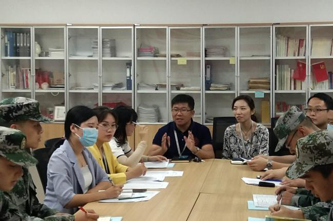 会上,陈老师就此次军训相关工作做出要求。他对军训期间的管理条例和训练方式进行了简要的阐述,并对教官、辅导员在军训期间的职责予以说明。同时,他强调了军训期间员工的安全问题,他提出应该在确保安全的前提下开展军事训练。他提议在军训期间可适当开展丰富多彩团队活动,以便提高新生的团队凝聚力、丰富新生的军训生活,帮助新生尽快适应老员工活。