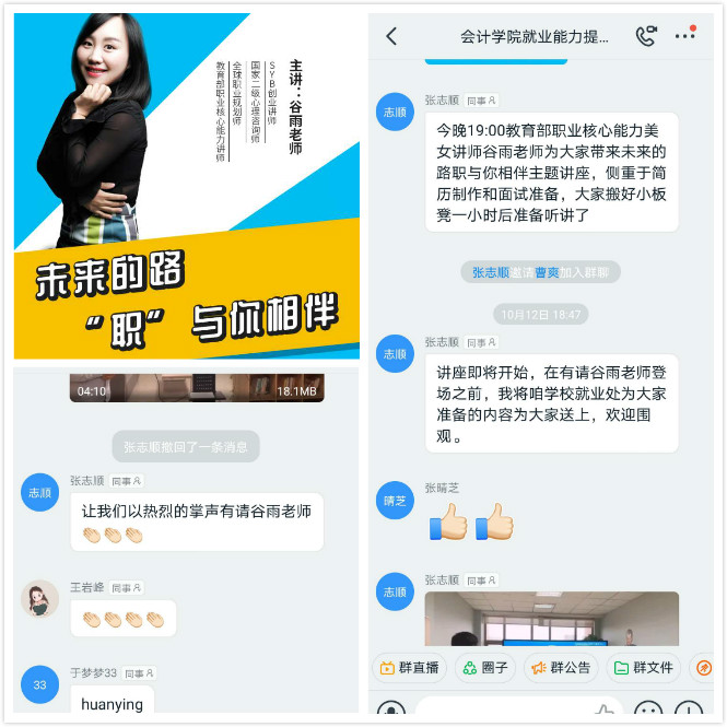 为应对当前不容乐观的就业形势,做好毕业生就业工作,加强对毕业生就业的指导与帮助,提升365VIP英国上市官网毕业生的就业意识,确定有效的职业发展目标,10月12日晚上七点公司组织了一场以“未来的路,‘职’与你相伴”为主题的钉钉直播形式的讲座,2021级全体毕业生参与了本次讲座。本次讲座的主讲人是北森生涯公司、教育部职业核心能力专家谷雨老师。