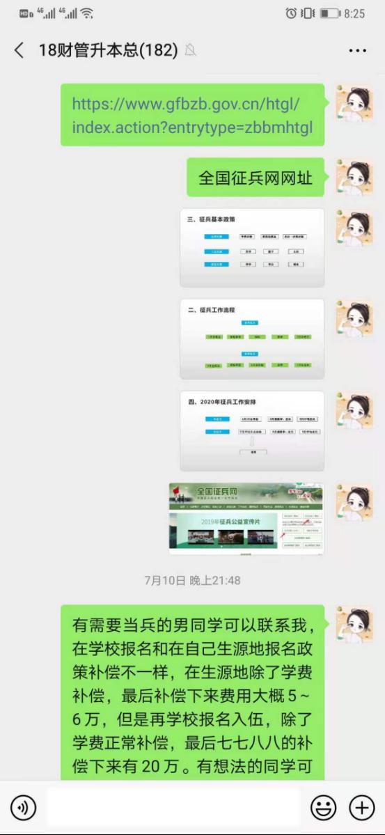 2020年7月11日,公司召开征兵工作会议后,18财升本1、2、3班紧接着召开了动员会。网络会上,18财升本1、2、3班辅导员老师鲁玲玉首先详细地传达了征兵工作会议上的内容,特别强调了此次新郑市走兵和生源地走兵的最大区别在于补偿款项的不同,从新郑市走兵赔偿款要多于生源地。其次,对于有意向需要咨询的同学一一给予了解答,解决了同学们思想上的包袱,助力员工积极参加征兵工作。
