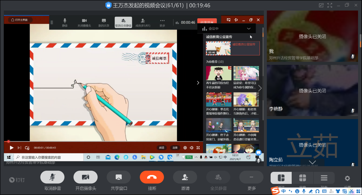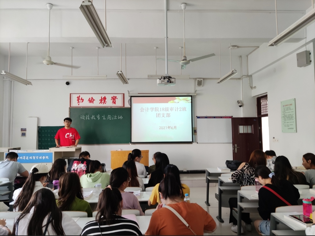 其中,18审计2班积极开拓创新宣讲方式,利用钉钉会议方式开展诚信教育线上教育活动,通过钉钉会议共同欣赏诚信教育公益宣传短片,并援引身边人身边事,积极开展榜样学习思想教育。除此之外,动员奖学金获得者、社会实践、志愿活动突出表现的员工积极为同学们分享经验,助力同学们共同成长。