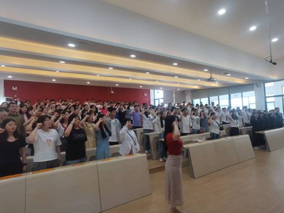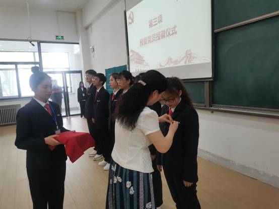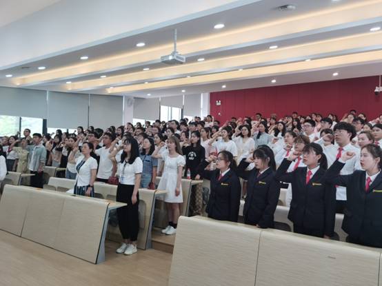 随后由张蕾书记为新发展党员代表佩戴党员徽章,并由员工第一党支部组织委员孟醒带领全体与会人员进行集体宣誓,毕业生党员全体重温入党誓词。