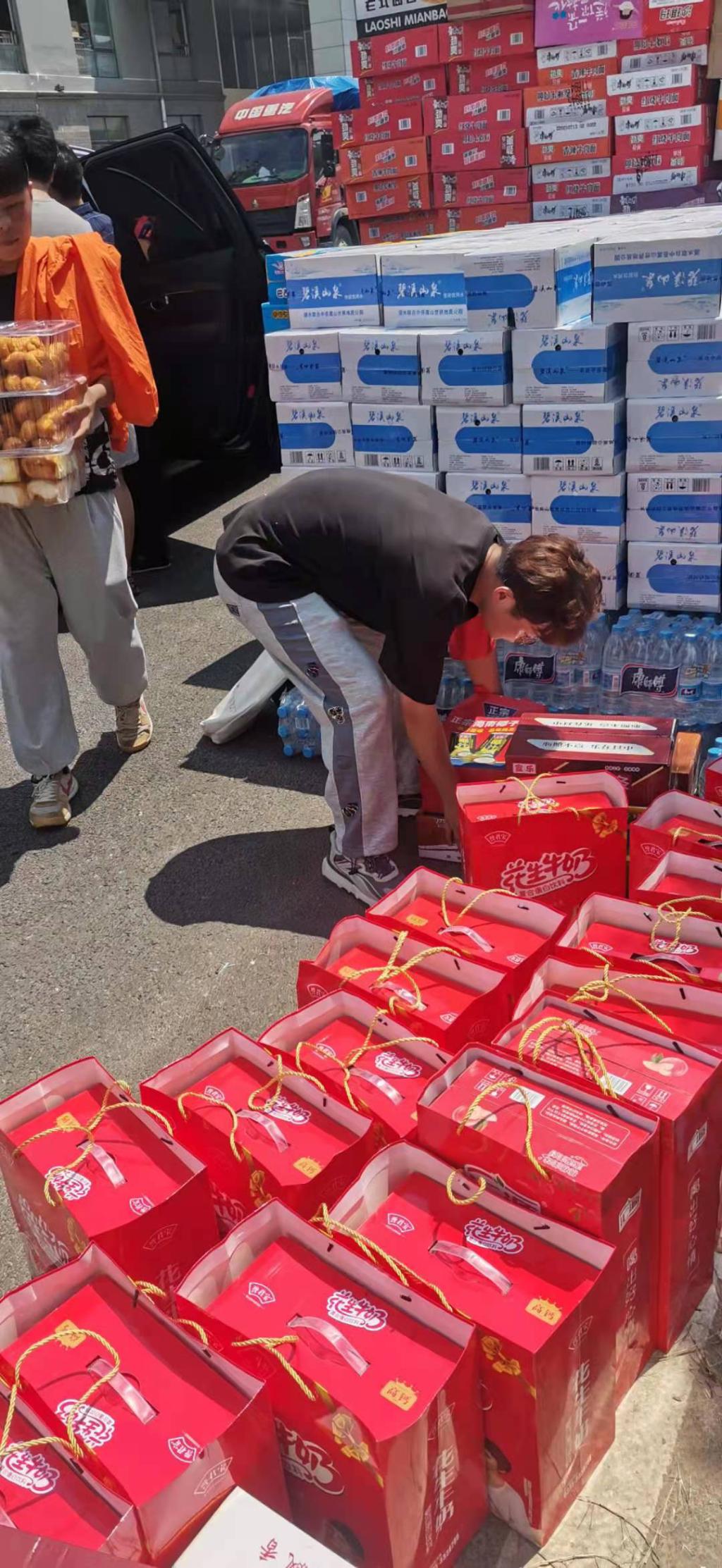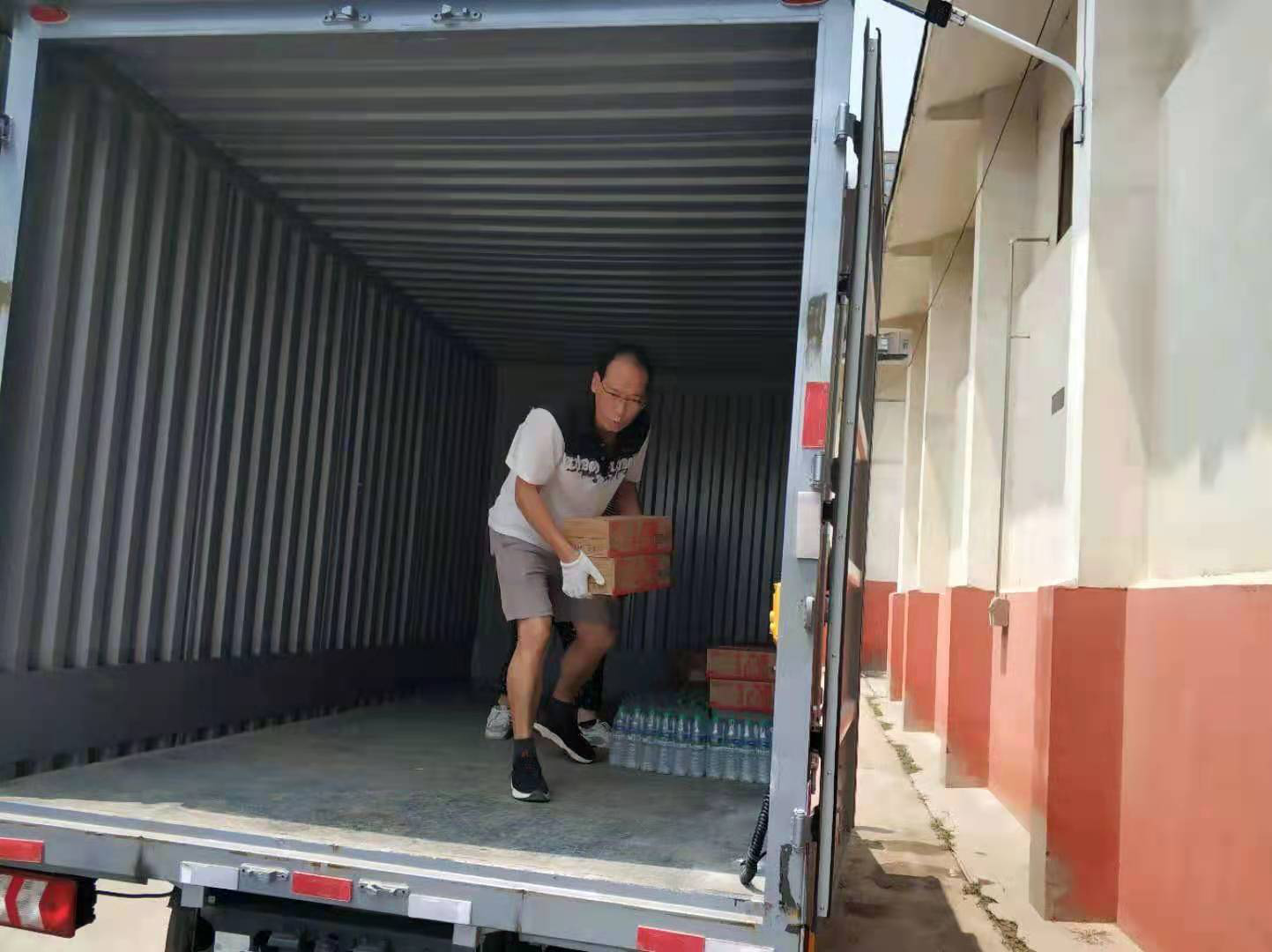 该同学第一时间报名成为志愿者,前往魏都路食品存储仓库,负责转运救灾物资,包括整理物资、贴标、搬运、装车等任务。与其他志愿者一起整齐排列,形成作业流水线,接力传递,将一件件物资传递到卡车上并进行整理装车。