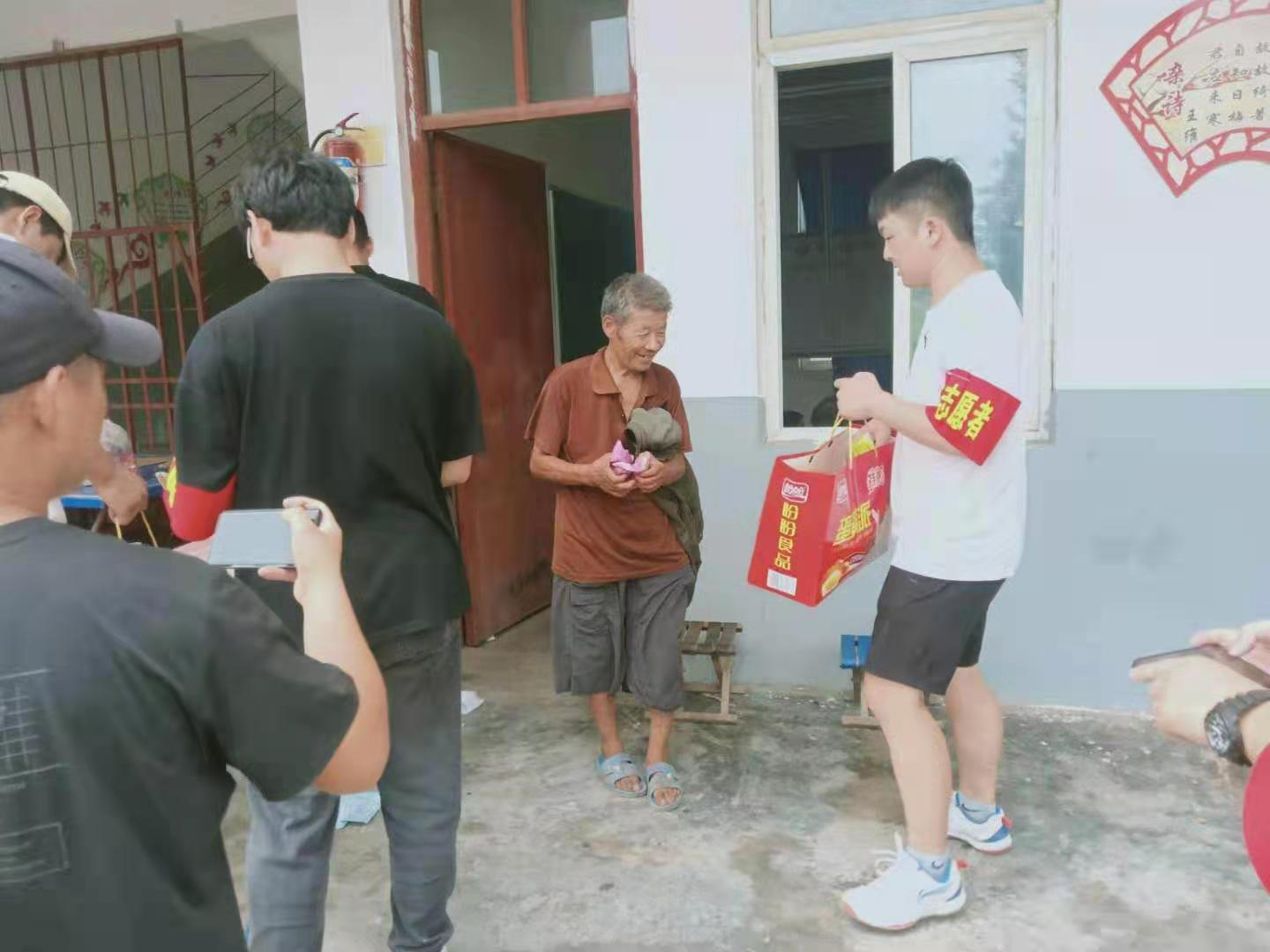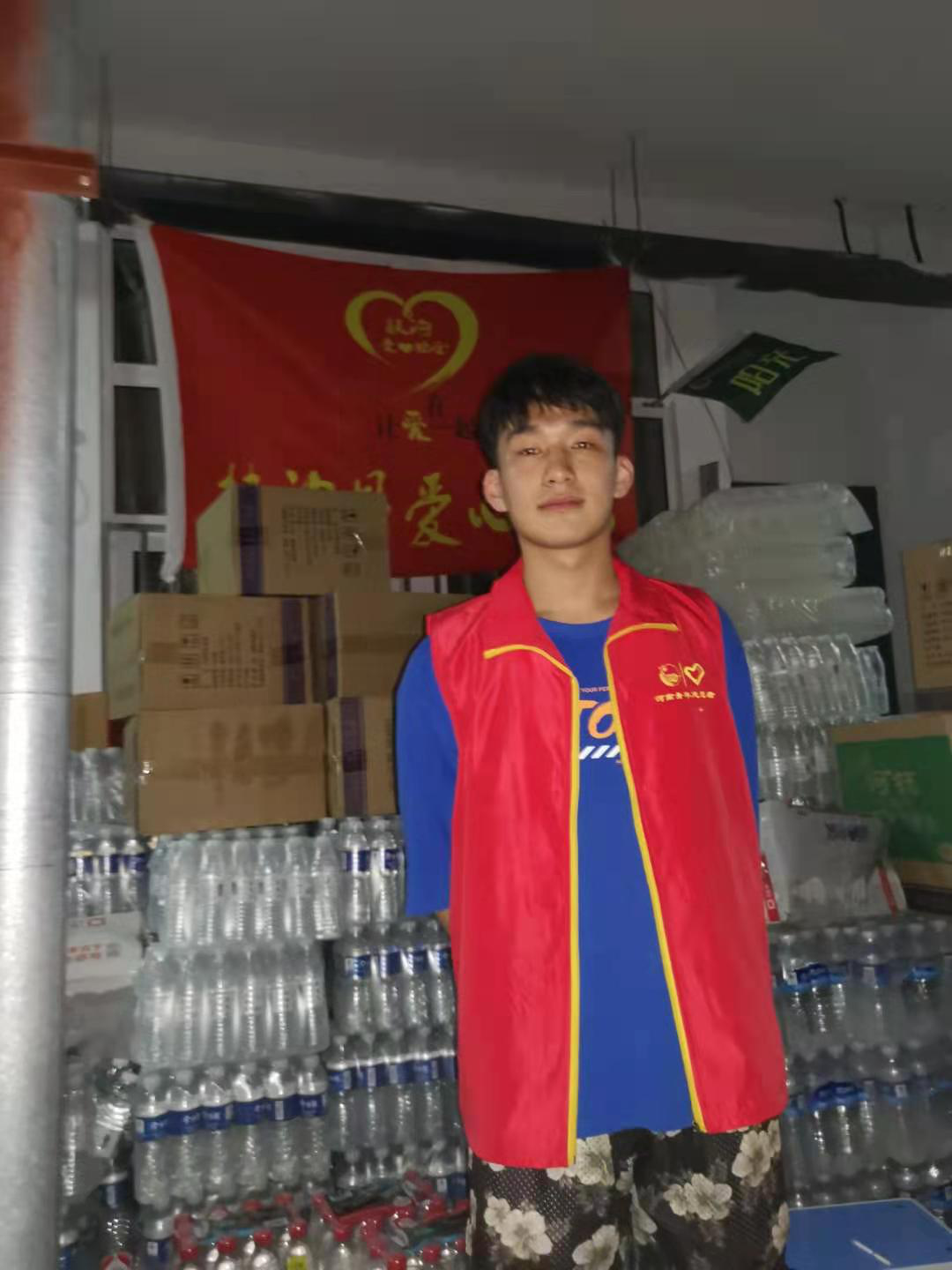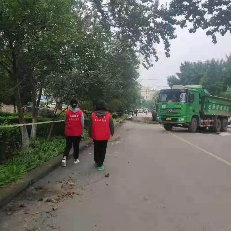 该同学主动加入洛阳市汝阳县城关镇北街社区组织的抗洪救灾志愿服务活动,主要负责捐赠的物资搬运、管理以及被洪水淹没地方卫生的清理等。