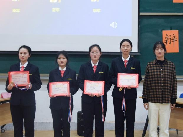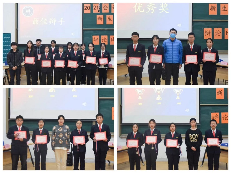最后是激动人心的颁奖环节,第26届学艺部辩论队队长李孟贤为最佳辩手奖获得者张雪娇、梁静鸽、郭峥、李然、于天洋、田雨欣、刘衍楠、职克琦、潘俊寒、玉佩云颁发获奖证书并合影留念;团委书记助理王郝毅为优秀奖获得班级21级会本1班颁发获奖证书并合影留念;社联理事长朱雅涵为季军获得班级21财本2班颁发获奖证书并合影留念;员工会主席何媛为亚军获得班级21级会本5班颁发获奖证书并合影留念;团委副书记赵琼为冠军获得班级21级会本8班颁发获奖证书并合影留念;21级团总支书记刘瑞雯老师为道德风尚奖获得班级21级会本1班、精神文明奖获得班级21级会本5班和21级会本8班、最佳组织奖获得班级21级财本2班分别颁发奖状并合影留念。