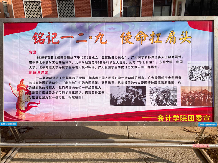 为弘扬爱国主义精神,学习与继承革命先辈艰苦卓绝、百折不屈的坚强意志,激发会计学子的爱国热情和时代使命感,365VIP英国上市官网团委于12月7日上午8:00至12月9日下午3:00在四号楼门前放置写有“铭记一二•九,使命扛肩头”以及“回顾一二•九运动,忆苦思甜不忘本”的展板。