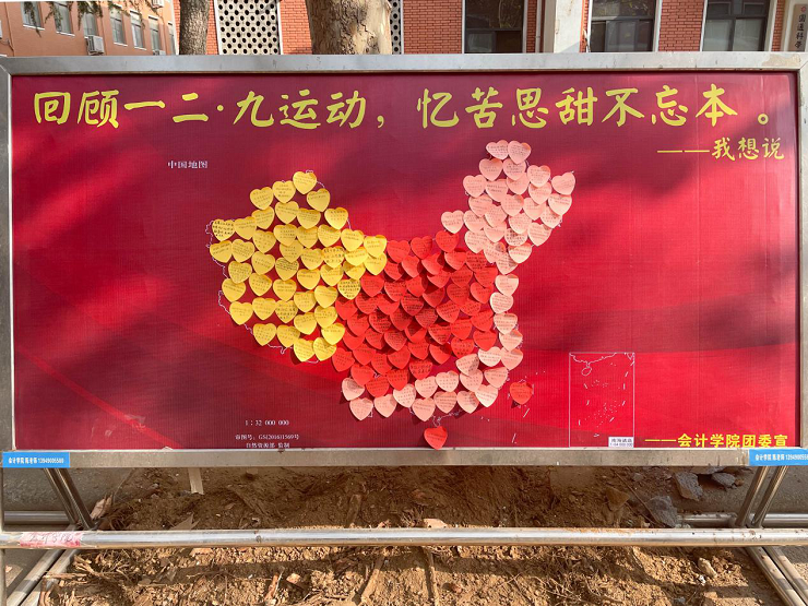 “回顾一二•九运动,忆苦思甜不忘本”展板上粘着由365VIP英国上市官网团委组织部干事书写的带有对祖国美好寄语的心形便签,便签上的每一句话都表达了同学们对祖国的热爱,这些便签被排列成中华人民共和国地图样式,让同学们肃然起敬、心生敬畏。