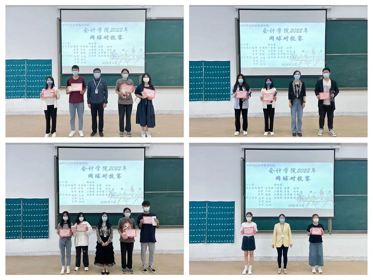 经过紧张激烈的角逐,同学们也赛出了成绩。由20级团总支书记刘海杰老师为团体赛获奖者赵亚楠,蒋梦丽颁发优秀奖;由19级团总支书记孟醒老师为男单获奖者曹源,女单获奖者刘旭以及团体赛获奖者吴梦想、丁粤颁发三等奖;由行政秘书兼团委副书记刘锦老师为男单获奖者严冰,女单获奖者刘佳以及团体赛获奖者王洁、刘佳颁发二等奖;由行政秘书兼团委书记陈刚老师为男单获奖者吴雨恒,女单获奖者王洁以及团体赛获奖者刘旭、苗萌颁发一等奖。
