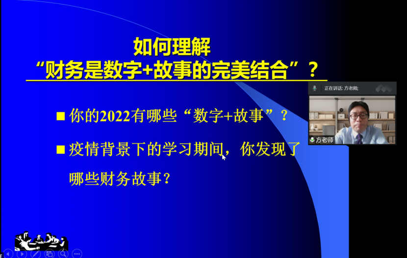 方教授以“你的2022有哪些数字+故事”?“疫情背景下的学习期间,你发现了哪些财务故事?”启发式设问开篇,通过自我求学、工作、学术经历的数字分享开始了本次的专题讲座,从苹果公司业绩、中国市值500强公司、螺蛳粉数字背后、阿里市值千亿大动荡到恒大地产、亚马逊的现金流,茅台的“高市值”,娓娓道来一个个鲜活案例背后的数字故事,引人入胜,风趣幽默。让同学们深刻认识到:一花一世界,一叶一菩提。财务上一个很小的数字,背后都有非常长的故事。“悦读”数字 ,财务管理就是故事书!