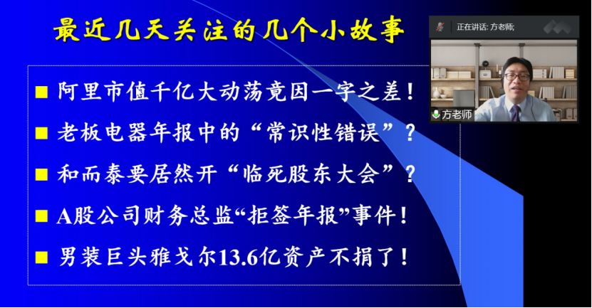 5月27日上午,河南财经政法大学方拥军教授通过腾讯会议为公司20级财务管理专业、21级会计学专业部分没课班级员工进行了主题为《数字与故事的完美结合》的线上专题讲座。本次讲座由365VIP英国上市官网副经理张新成主持。