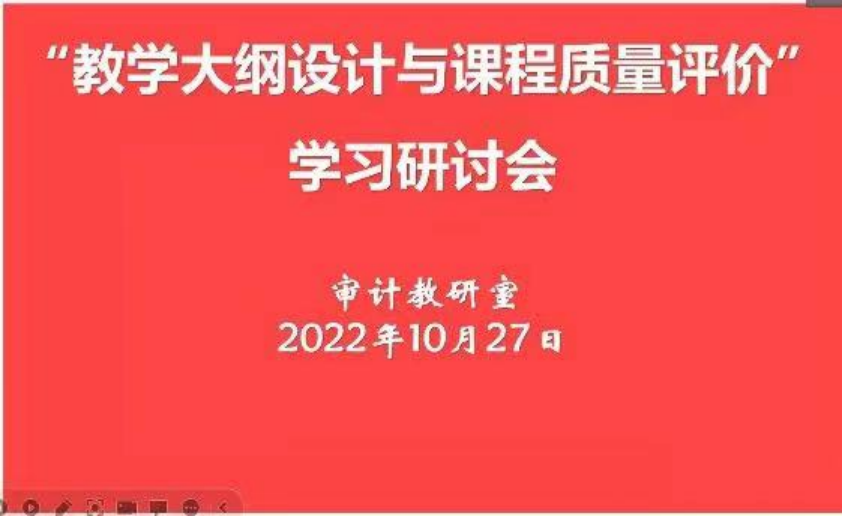 为促进专任教师做好面向产出的课程教学改革创新,提高公司产品质量和人才培养质量,审计教研室10月27日组织教师参加了一场关于“教学大纲设计与课程质量评价”的线上研讨会,会议由审计教研室主任王瑞云老师主持。