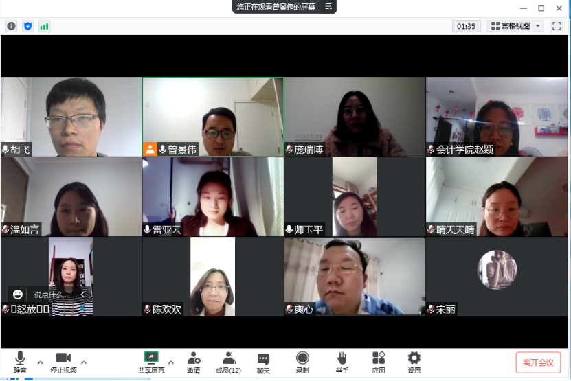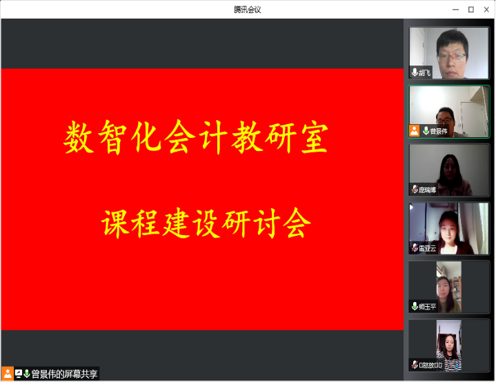为强化数智化会计相关课程的建设,进一步助力公司教学质量提升,2022年11月1日晚上19:30-20.30,数智化会计教研室通过腾讯会议召开线上研讨会。会议由数智化会计教研室主任曾景伟老师主持,数智化会计教研室全体教师参会。