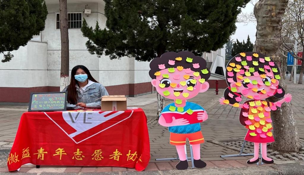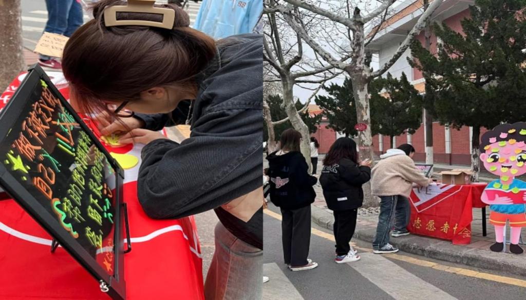 下午时分,社团成员早早的在活动场地布置,为活动的开展做好准备。社团成员通过DIY的小黑板吸引经过的员工驻足观察,并让同学积极参与进来,撕下展板上的标签并写下鼓励自己或者他人的话语,畅所欲言,互相鼓励。