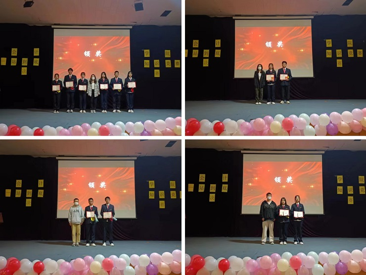 到了最激动人心的颁奖环节。由员工会副主席孙璇为优秀奖获得者22级会本7班、22级会本4班、22级会专5班颁发获奖证书并合影留念;由员工会副主席崔英丽为季军获得者22级税本1班颁发获奖证书并合影留念;由社联副理事长任旌旗为亚军获得者22级财本1班颁发获奖证书并合影留念;由团委书记助理谢振江为冠军获得者22级审本2班颁发获奖证书并合影留念;由员工会主席李文姗为道德风尚奖获得者22级会本8班、精神文明奖获得者22级税收2班、最佳组织奖获得者22级会本6班颁发获奖证书并合影留念。