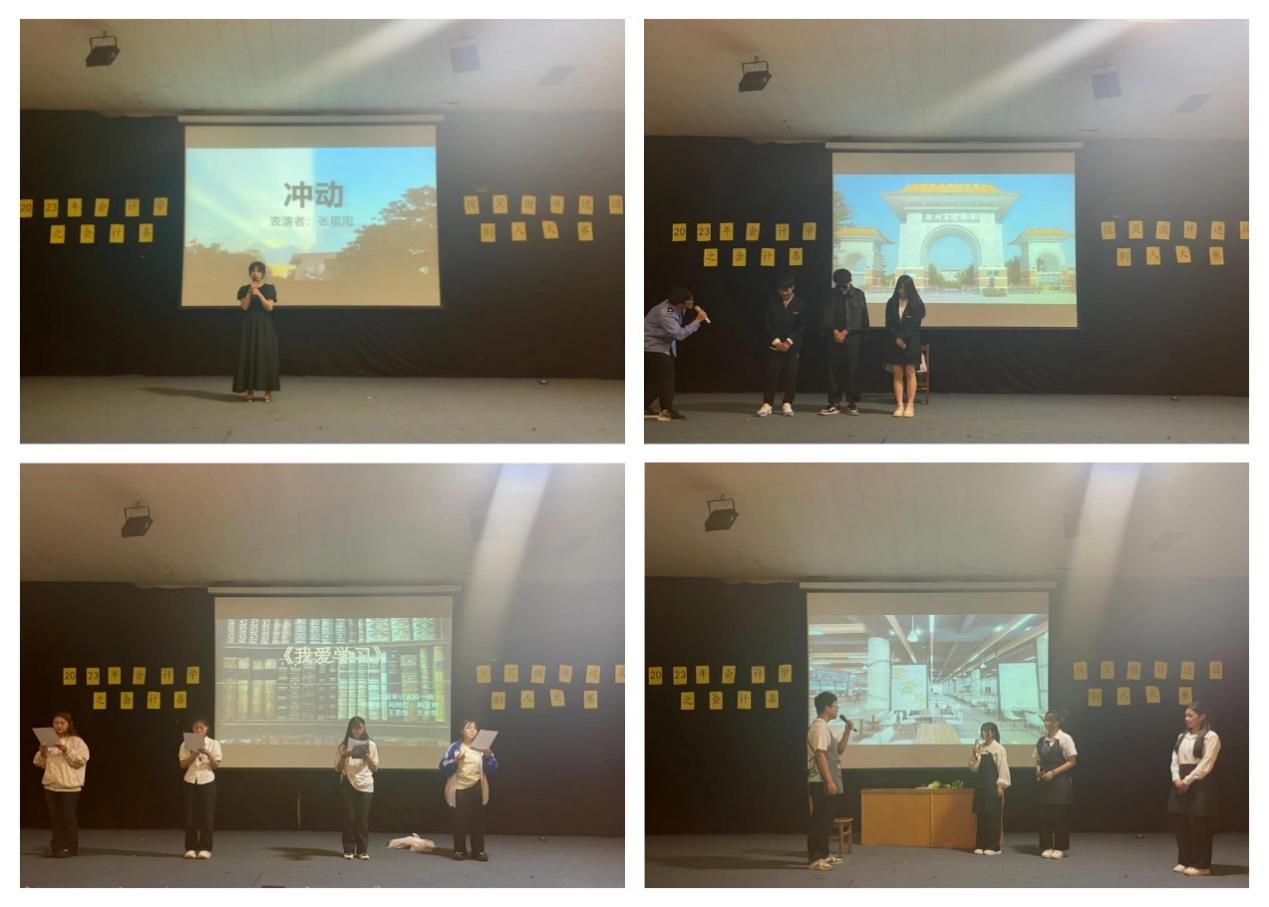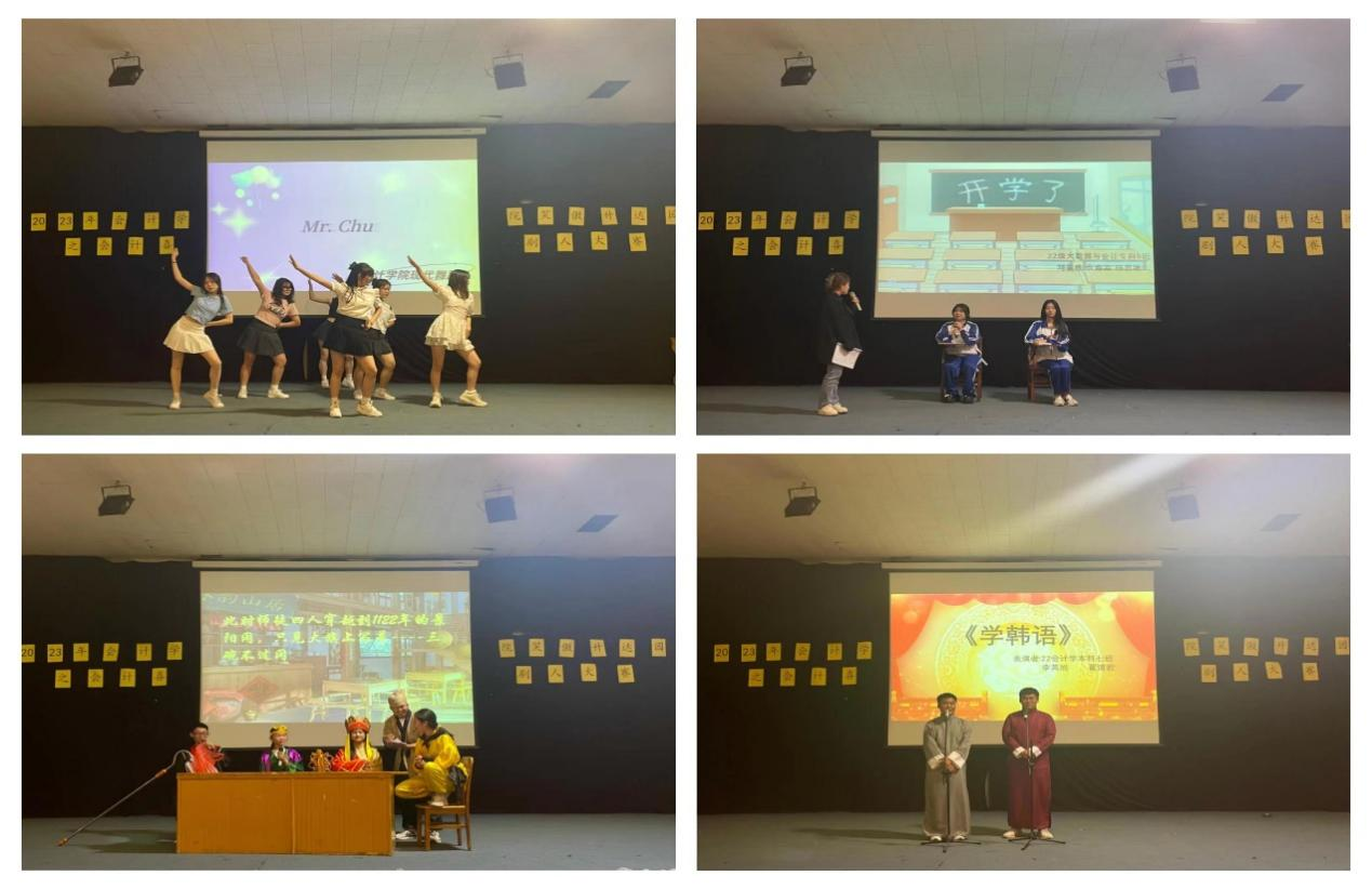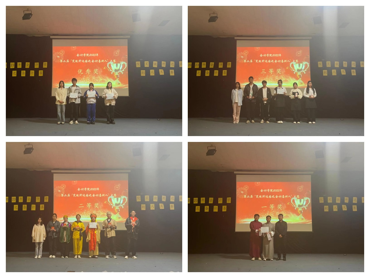 到了最激动人心的颁奖环节。由李婉晨为优秀奖获得小组小品《开学了》、小品《推销》及朗诵《我爱学习》颁发获奖证书并合影留念;由孙莹为三等奖获得小组小品《说说咱食堂》颁发获奖证书并合影留念;由王怡凡为二等奖获得小组小品《小话西游2》颁发获奖证书并合影留念;由陈刚老师为一等奖获得小组相声《学韩语》颁发获奖证书并合影留念。至此,本次比赛圆满结束。