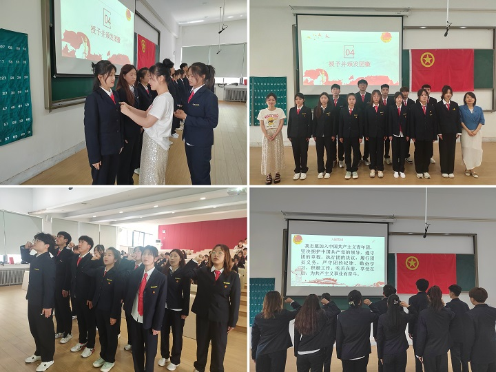 首先,支园园老师宣读了新团员的名单。接着,由支园园老师和杨柳老师为新团员授予并佩戴团徽。新团员在组织部副部长武佳威的带领下,面对鲜艳的共青团团旗进行了庄严的宣誓。