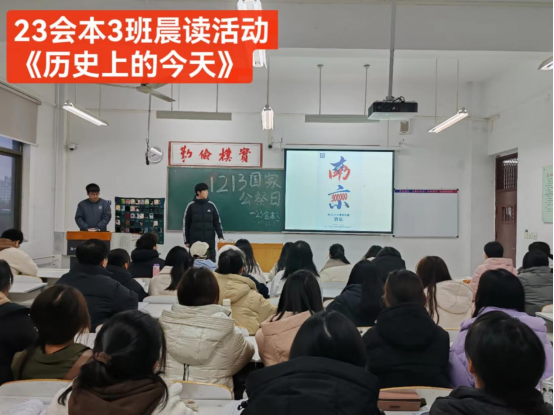 铭记历史,学习典故。有的班级开展《历史上的今天》的晨读分享活动。分享者带领同学们共同回顾历史上的今天发生的重大事件,或者对重要的国家纪念日、传统节日的历史渊源进行讲述,帮助同学们了解历史、铭记历史,以史为鉴、继往开来。