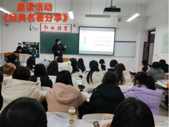 从“阅读”到“悦读”。有的班级开展《经典名著分享》的晨读分享活动。每天有一名同学作为主讲人,向同学们分享一部经典文学著作,从介绍名著的作者、写作背景、社会影响、文学价值到分享其中的经典桥段,再到阐述个人感悟。每天一部经典名著的分享与学习,使同学们增强了阅读兴趣,锻炼了学习、归纳能力,更大程度的爱上阅读。