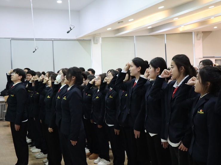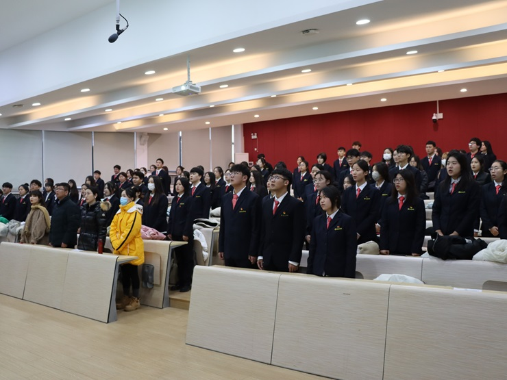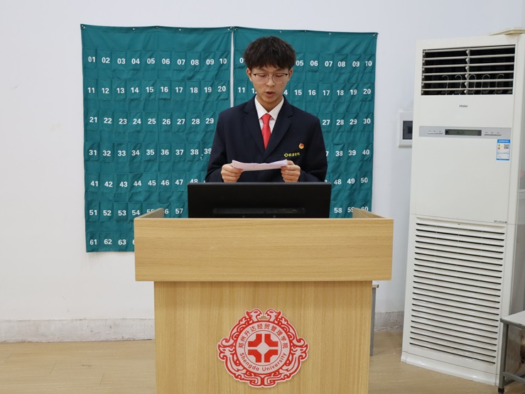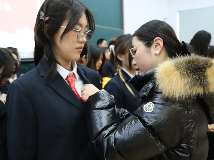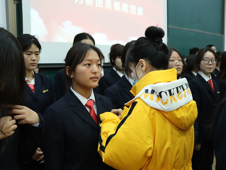仪式在庄严的国歌中拉开帷幕,然后胡淑娟老师宣读了新发展团员名单,接着伴随着共青团团歌,胡淑娟老师、杨柳老师和刘瑞雯老师为新发展团员佩戴团徽。随后组织部副部长李家和带领新发展团员在共青团团旗下庄严宣誓,主持人田浩然宣读团员义务和权利团章规定,筑牢团员的思想根基,帮助团员进一步提升自身素质,原航作为新发展团员代表进行发言,黄文浩作为老团员代表发言,给予了新发展团员鼓励。最后陈刚老师发言,陈刚老师希望新团员们拥有阳光心态,以积极的心态应对人生的一切艰难险阻,创造崭新的生活。